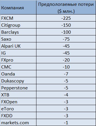 События «Черного четверга», как его окрестили эксперты и журналисты, заслуживают отдельного и подробного анализа, который мы впоследствии проведем в ходе одного из наших следующих вебинаров. А пока вашему вниманию мы хотели бы предоставить собранную нами информацию, которая отражает потери некоторых известных компаний после событий 15 января: